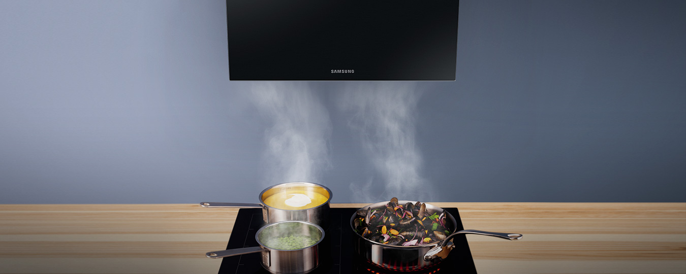 Висока ефективність пристроїв Samsung (до 760 м3/год) забезпечує свіже і чисте повітря в будь-який час, незалежно від того, яка їжа готується. Додаткова функція Booster полегшує роботу миттєво позбутися від пари та запахів.