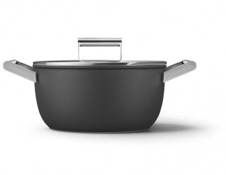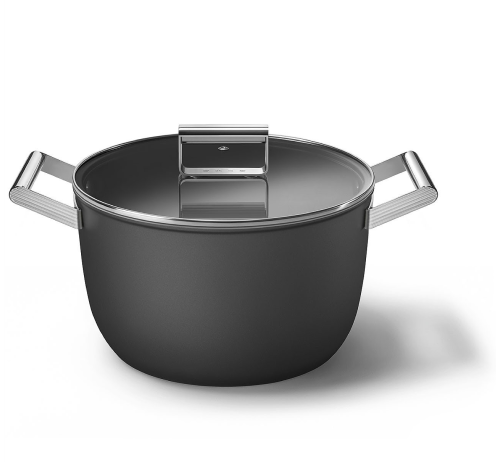 Нова серія посуду Smeg складається з кількох різних типів продуктів: сковорідки, каструлі, воки та каструлі. Завдяки запатентованому дну всі вироби сумісні з будь-яким типом плити. Крім того, використання ручок з нержавіючої сталі в поєднанні з кришками із загартованого скла дозволяє використовувати посуд в духовці при температурі до 250°C і мити в посудомийній машині.Каструлі доступні в двох розмірах: з низькими бортами з діаметром. 24 см (ємкість 4,6 л) і високобортова діаметром 26 см (ємність 7,7 л).