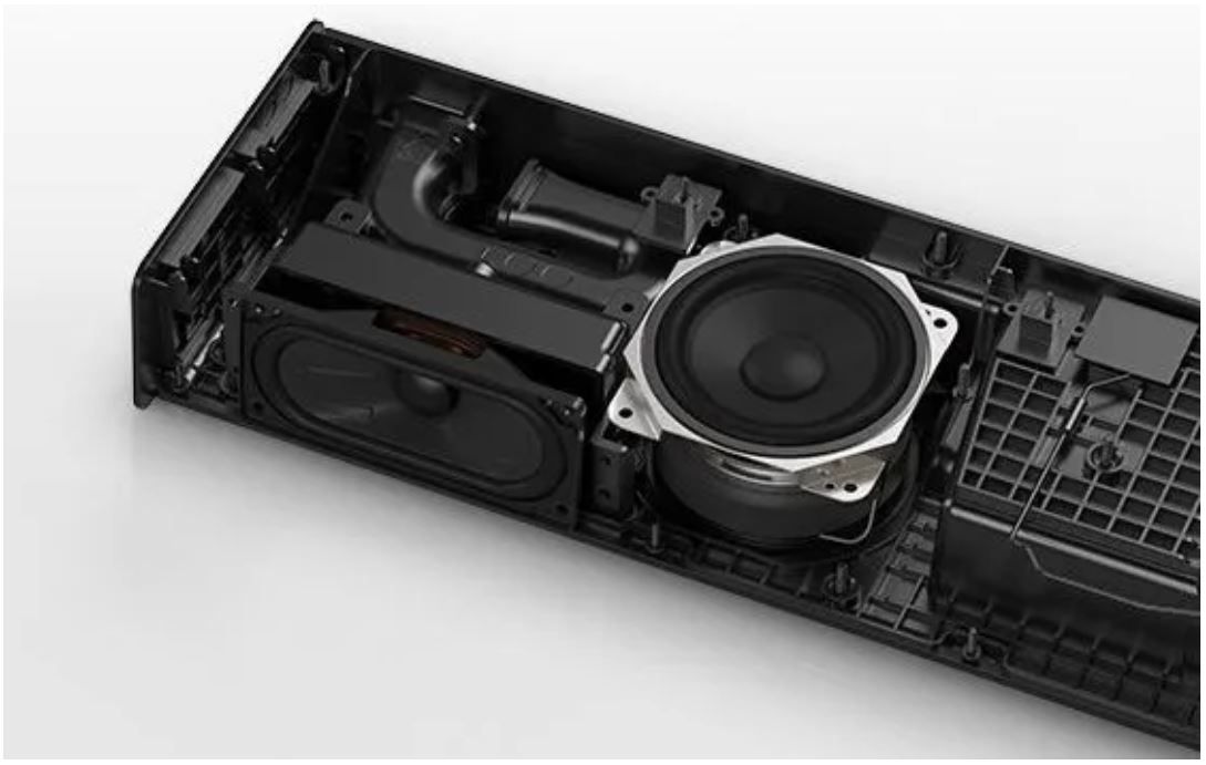 Басові динаміки елегантно вбудовані в звукову панель, які забезпечують низькі звукові частоти та забезпечують потужні баси.