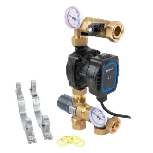 Змішувальний модуль BTU 501 AP для теплої підлоги з клапаном ATM 561, насосом AFRISO APH 160 ЗАСТОСУВАННЯ Використовується в системах опалення. Встановлюється між джерелом тепла та розподільником поверхневого опалення в розподільній шафі. Він готує середовище до відповідної температури та подає його в контури опалення розподільника. ОПИС Оснащений термостатичним змішувальним клапаном, який підтримує задану на ручці температуру подачі в діапазоні 20-43°C. Циркуляційний насос AFRISO APH 160 контролює температуру середовища. Запірна арматура дозволяє ізолювати циркуляційний насос від живильної балки розподільника. ЕЛЕМЕНТИ ЖИВЛЕННЯ Два підвіси з відстанню 220 мм для латунних колекторів з поперечним перерізом балки С7. Набір прокладок.