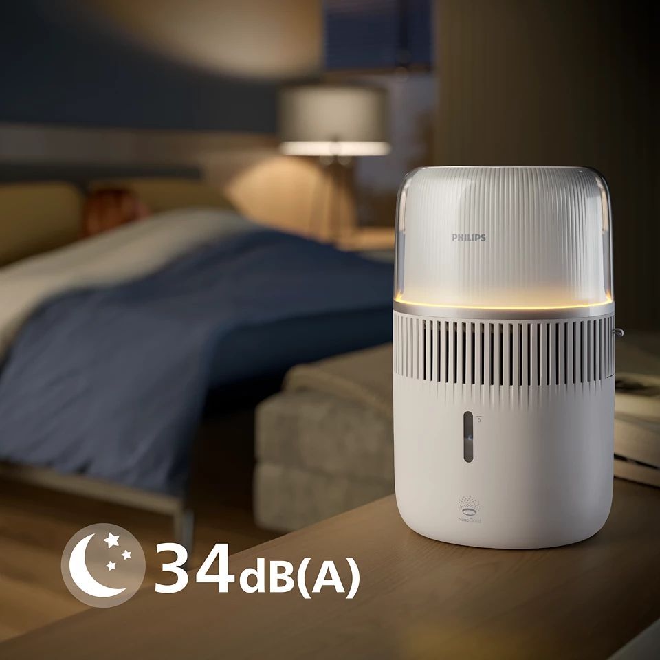 Немає жодної іншої технології зволоження, яка виділяє чистішу водяну пару, ніж технологія випаровування Philips NanoCloud – вона випускає зволожене повітря в кімнату з до 99% меншою кількістю бактерій, ніж стандартні ультразвукові зволожувачі (4). Зволожувач повітря Philips ідеально підходить для дитячих кімнат і безпечний для використання з водопровідною водою.