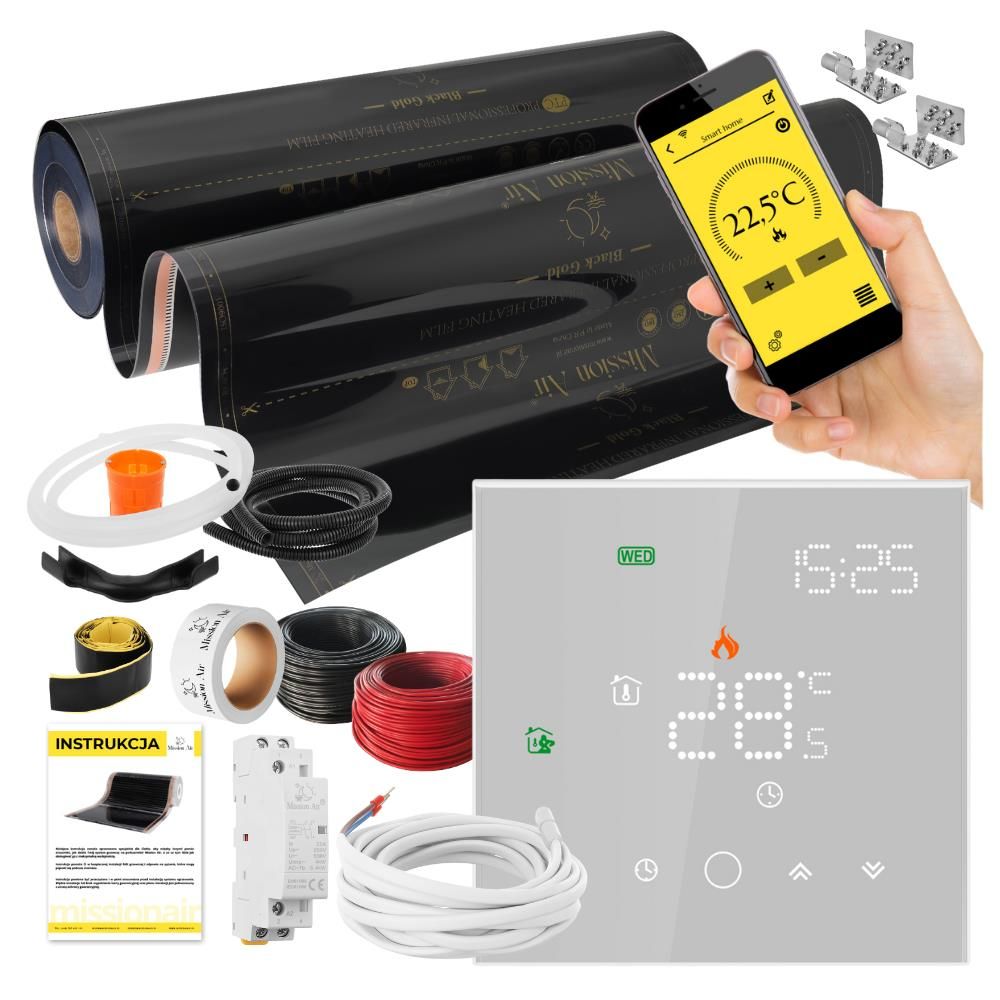 Повний набір інфрачервоного обігріву, який можна використовувати як: Тепла підлога Настінне опалення Стельове опалення Дзеркальне опалення (антипара) Набір включає: IR BLACK GOLD PTC нагрівальна плівка 160 Вт/м², ширина 100 см Терморегулятор Підлоговий NTC 10 Ом датчик температури* З’єднувальні конектори Стрічка самовулканізуюча електрична коробкаЗахисна труба для кабелівЗахисна труба для датчика температури*Направляюча дуга*2,5 мм² Кабелі живлення двох кольорів*елементи недоступні в конфігурації з регулятором GeminiОкрема кількість аксесуарів для підключення наведена в таблиці нижче.Гарантія на плівку: термін служби