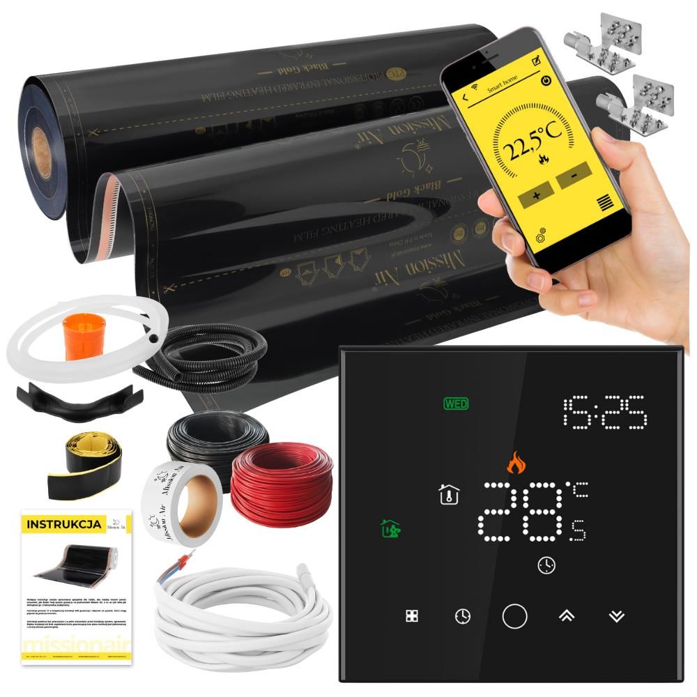 Повний набір інфрачервоного обігріву, який можна використовувати як: Тепла підлога Настінне опалення Стельове опалення Дзеркальне опалення (антипара) Набір включає: IR BLACK GOLD PTC нагрівальна плівка 160 Вт/м², ширина 100 см Терморегулятор Підлоговий NTC 10 Ом датчик температури* З’єднувальні конектори Стрічка самовулканізуюча електрична коробкаЗахисна труба для кабелівЗахисна труба для датчика температури*Направляюча дуга*2,5 мм² Кабелі живлення двох кольорів*елементи недоступні в конфігурації з регулятором GeminiОкрема кількість аксесуарів для підключення наведена в таблиці нижче.Гарантія на плівку: термін служби