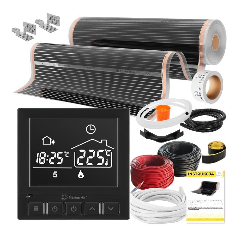 Повний набір інфрачервоного опалення, який можна використовувати як: Тепла підлога Настінне опалення Стельове опалення Дзеркальне підігрів (антипаровий) Набір включає: IR BLACK SILVER PTC нагрівальна плівка 160 Вт/м², ширина 100 см Терморегулятор Підлоговий NTC 10 Ом датчик температури * З’єднувальні конектори Стрічка самовулканізуюча електрична коробкаЗахисна труба для кабелівЗахисна труба для датчика температури*Направляюча дуга*2,5 мм² Силові кабелі в двох кольорах*елементи недоступні в конфігурації з регулятором GeminiОкрема кількість з’єднувальних аксесуарів наведена в таблиці нижче.Гарантія на фольга: 10 років