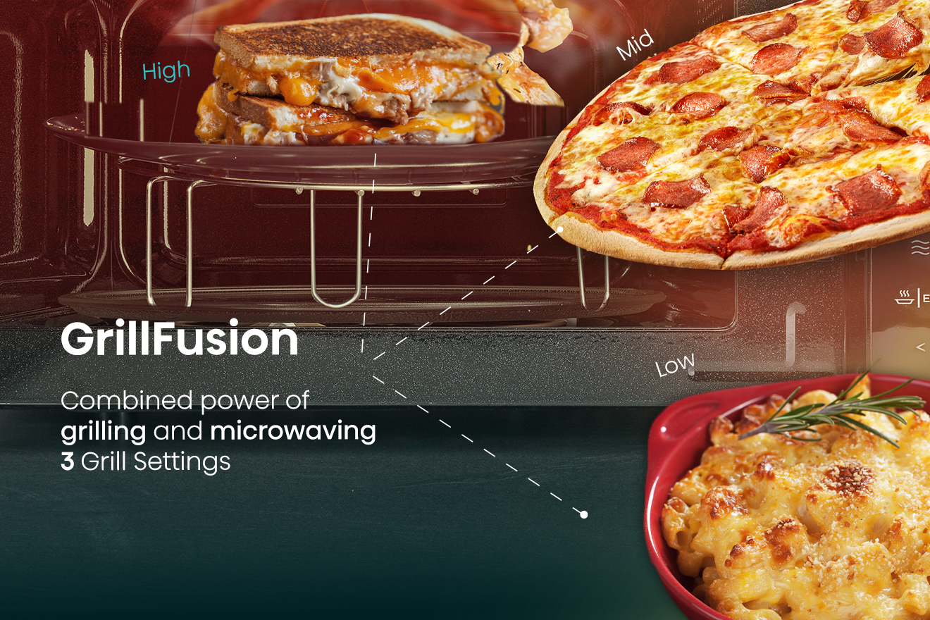 Є три можливі способи використання опції гриля. Готуйте на грилі лише до тих пір, поки їжа не стане золотисто-коричневою, або використовуйте одну з двох комбінацій гриля та мікрохвильової печі (більше мікрохвильової печі та менше гриля / менше мікрохвильової печі та більше гриля), що дозволяє приготувати менший шматок м’яса чи навіть піцу набагато швидше.