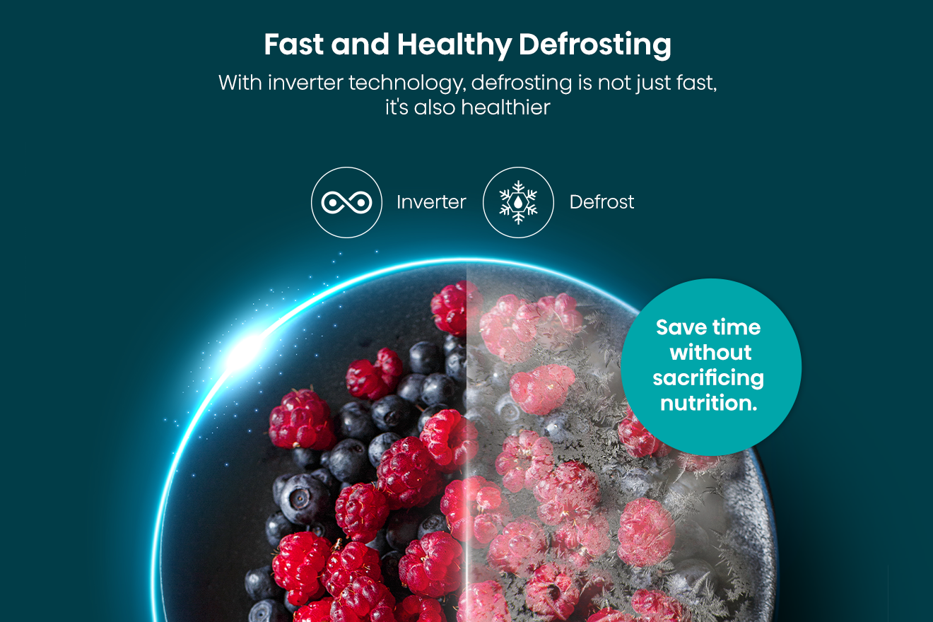 Щоб гарантувати, що продукти залишаться в ідеальному стані після розморожування, важливо розморожувати їх швидко та ефективно. Завдяки функції розморожування в мікрохвильовій печі тепло надходить до їжі рівномірно. Немає необхідності вручну зменшувати потужність.