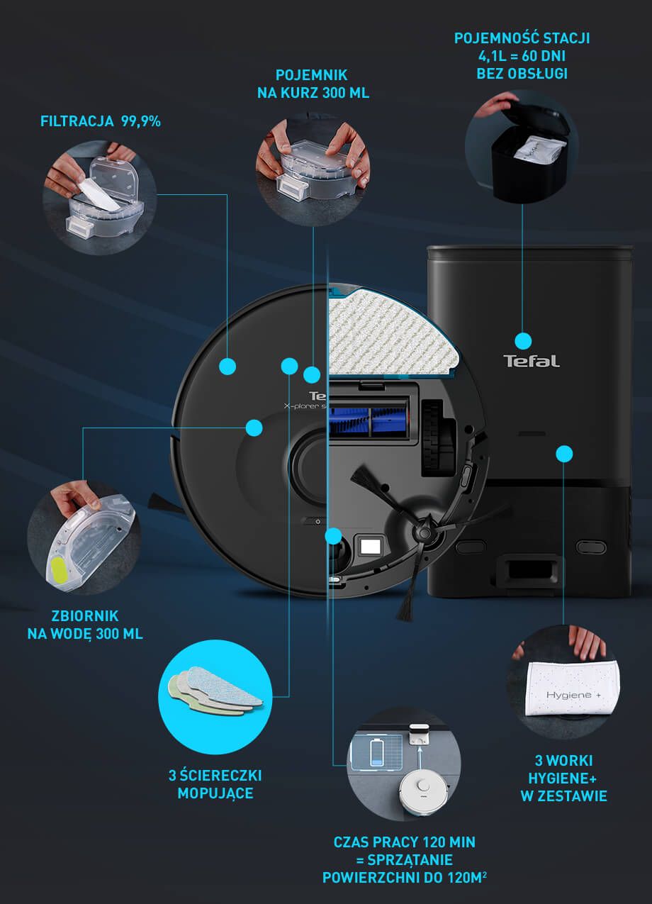 Незалежно від того, чи хочете ви почистити килими чи підлогу, завдяки потужності всмоктування 2700 Па, 4 ефективним режимам роботи та здатності досягати висоти 18 мм автоматичний робот Tefal Xplorer S75 S+ очистить будь-яку поверхню.
