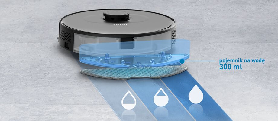 Система Smart Aqua Power і 3-рівневе регулювання води дозволяють налаштувати інтенсивність миття в залежності від типу підлоги. Резервуар на 300 мл гарантує, що робот зможе очистити навіть великі суміші.